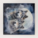 Two wolves in winter with snow, stars and moon