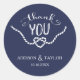 Nautical thank you sticker with your names and wedding date in white on navy blue.