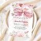 An elegant white background, decorated with a large pink bow and pink flowers. Personalise and add a name and party details. Text: She's tying the knot.