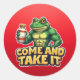 Bring fun and bold energy to your messages with this vibrant green frog sticker! Featuring a muscular cartoon frog holding a clearly labelled "Tylenol" bottle, this sticker combines humour and charm in a playful design. The thick bold outlines and bright colours make it pop on any background, while the catchy text “COME AND TAKE IT” adds attitude and personality. Perfect for digital messaging apps, laptops, water bottles, notebooks, or any surface you want to decorate with a unique, eye-catching sticker. High-resolution PNG with transparent background ensures crisp, clean visuals. Original AI-generated artwork, ready to brighten your day!