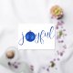 The greeting card uses a blue Christmas ornament with real foil accents as the "o" (typography) in "joyful". The option to change the gold to silver or rose gold is available. The back of the card includes the sender's address and greeting.