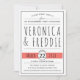 Modern black and white typography wedding engagement party invitation accented with living coral colour. It features your text in black on white and the date of your party on a coral banner. The back includes a pattern with white crosses on coral.