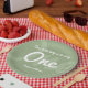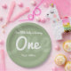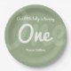 Our little baby is turning one first baby birthday round paper plates. These plates are sage, green, with white. The word "One" is in large letters in a cute typography style with a modern and minimal design. Simply, customise these plates, add them to your cart, and happy birthday to your wonderful baby!