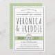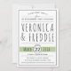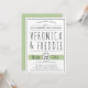 Modern black and white typography wedding engagement party invitation accented with sage green colour. It features your text in black on white and the date of your party on a green banner. The back includes a pattern with white crosses on sage.