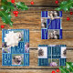 Create your own custom wrapping paper sheets assortment with up to 5 of your photos in square format and a typography chequerboard pattern design in a chic colour palette of navy and dark blue. Sheet one has a template for up to two of your favourite photos bordered in sky blue set on a background of dark lapis blue and MERRY in a modern arrangement of simple lighter sky blue text. Sheet two has a template for you to upload one photo, with alternating frames of cornflower blue and sky blue and JOY alternating between the same two light shades of blue in between the check pattern of pictures on a classic bright navy blue background. The final sheet of personalised photo gift wrap, sheet three, has a template for up to two of your treasured pictures bordered in a cornflower blue set on background of deep ocean blue and MERRY again in a modern arrangement of medium ocean blue text. Add your photos to this assortment of Christmas wrapping paper templates in chic shades of dark blue and navy for three sheets of holiday gift wrapping cheer.