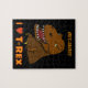This custom jigsaw puzzle has a scary Tyrannosaurus Rex, or T-rex dinosaur, on it. It says, "I love (heart) T-rex." There is room for your name on the top. Replace the sample with your child's name to make him or her into the name of a dinosaur.