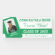 This bold text design has a template to input the name of your high school or college, class year, grad's name and image as well as a personal message. If your grad's school colours include green, just change the white background if necessary to match their second colour.
