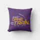 The UAlbany Dane Train logo features bold, angular typography with the words "Dane Train" in large, purple capital letters. Above it, "UAlbany" is written in a smaller, golden font. The design incorporates the silhouette of a train, with smoke billowing from the smokestack. The train's wheels are represented in gold, giving the appearance of movement, and golden streaks on the left emphasize speed and momentum. The logo exudes a dynamic and energetic vibe, combining elements of strength and motion, reflecting a sports or team spirit.
