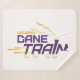 The UAlbany Dane Train logo features bold, angular typography with the words "Dane Train" in large, purple capital letters. Above it, "UAlbany" is written in a smaller, golden font. The design incorporates the silhouette of a train, with smoke billowing from the smokestack. The train's wheels are represented in gold, giving the appearance of movement, and golden streaks on the left emphasize speed and momentum. The logo exudes a dynamic and energetic vibe, combining elements of strength and motion, reflecting a sports or team spirit.