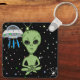 Alien waving with starry background with UFO for those interested in UFOlogy.