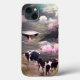Unsuspecting black and white Holsteins grazing in a field while a spaceship hovers in the distance. Another typical cow abduction on the old MacDonald farm. Wombo Dream AI and artist collaboration.