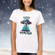 Alien and UFO graphic for those into UFOlogy. A cute alien being breamed down from a UFO. Text says, "UFO Hunter" in black and turquoise women's shirt.