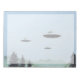 A watercolor, pen and ink, and colour pencil drawing of three saucer UFOs over the mountains.
