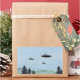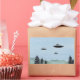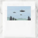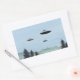 A watercolor, pen and ink, and colour pencil drawing of three saucer UFOs over the mountains.