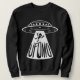 Vector cartoon illustration of a UFO abducting a person that thinks aliens rock with UFOMG text. Tags: UFO, OMG, unidentified, flying, object, oh, my, god, space, spaceship, alien, martian, cartoon, devil, horns, abduction, fourth, kind, humour, saucer
