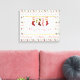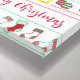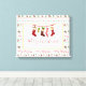 Canvas art with a repeating pattern in the background, in an ugly Christmas sweater style. The pattern is composed of socks, christmas balls, stars and snowflakes. With repeating Merry Christmas text in red. Fun and festive. Layered over top is a white rectangle with a faux gold foil border, inside is an illustration of old-fashioned hanging stockings and the text: Merry Christmas.