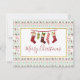 A flat holiday greeting card with a repeating pattern in the background, in an ugly Christmas sweater style. The pattern is composed of socks, christmas balls, stars and snowflakes. With the repeating Merry Christmas text in red. Fun and festive. Layered over top is a white rectangle with a faux gold foil border, inside is an illustration of old-fashioned hanging stockings. Merry Christmas written in a trendy font. The back has a message you can personalise.