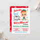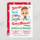 Ugly Sweater Baby Shower Invitation. Features a baby boy dressed in his Christmas sweater, diaper and elf hat. Colourful fonts and snowflakes.