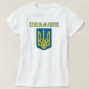The state coat of arms of Ukraine, commonly know as Tryzub. This blue and gold, trident is the national coat of arms of Ukraine. The word Ukraine is written above the shield, also in blue and gold, the colours of the Ukrainian flag.