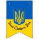 Bunting banner with the flag of Ukraine, a blue and yellow flag with the Ukrainian coat of arms (emblem) with a trident in the centre, and a custom text template for your message