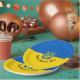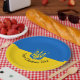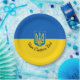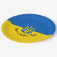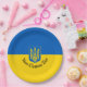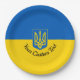 Paper plates with the flag of Ukraine, a blue and yellow flag with the Ukrainian coat of arms (emblem) with a trident in the centre, and a custom text template for your message