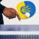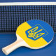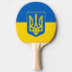 Ping pong paddle with the flag of Ukraine, a blue and yellow flag with the Ukrainian coat of arms (emblem) with a trident in the centre