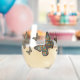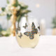 The wings, body, and antennae of a monarch butterfly are decorated with patterns found in pysanka, a traditional Ukrainian method for decorating Easter eggs. These include geometric patterns, plant motifs, and designs based on man-made agricultural objects in shades of red, orange, green, blue, dark grey, and white. This glassware is also available in can glass and rocks styles.