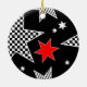 Don't stare at this ornament for too long or your mind will play tricks on you! The front is a whirling pattern of black and white blocks that appears to be going down into a whirlpool hole. The reverse side is black and white checked and striped stars and one solid red one. Fun ornament for the teenagers and young adults, or graphic artists!