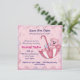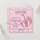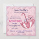 Sweet baby girl shower invitation with adorable pink teddy bear riding in an umbrella, big dots and other special touches. Customise with Your information.