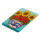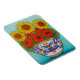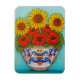 Stylised vibrant sunflowers & poppies in a beautiful Umbrian Deruta ceramic vase by Lisa Lorenz on a magent