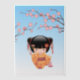 Vector illustration of a cute oriental girl in a peach colour kimono dress with wide plum obi sash holding a pink kinchaku drawstring bag. The girl's black hair is decorated with ribbons and geisha style hairpins. The doll is named after Japanese ume tree that is related to both plum and apricot trees. This artwork was inspired by traditional kokeshi dolls of Japan. Light blue background is decorated with blooming ume tree branches.