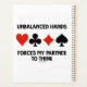 Showcase your wry bridge / duplicate bridge sense of humour with this planner featuring the four card suits along with the saying "Unbalanced Hands Forces My Partner To Think". Make others do a double-take on how you bid and play unbalanced hands with this bridge saying planner today!