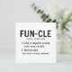 Simple happy birthday uncle design with the quote "Fun-cle noun (fuhn-kel)..." This fun uncle birthday greeting in the form of a definiton makes a nice gift for the bonus dad in your life.