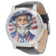 Smiling uncle Sam USA American Icon wearing an American suit and a waving American flag in the background