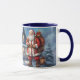 The classic vintage mug with image of Santa Claus is a heartwarming depiction of holiday cheer. Santa Claus, in his iconic red suit with white trim, is seen with a jovial smile and twinkling eyes that radiate kindness and joy. His round belly, indicative of his jolly nature, is covered by a large, golden buckle belt. In his gloved hands, he holds a sack overflowing with beautifully wrapped presents, ready to be delivered.
