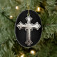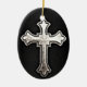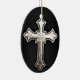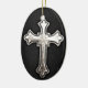 Metal cross on black leather background