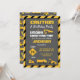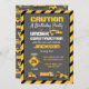 Cute under construction birthday party invitation. Grey, yellow, black and white colour scheme with construction truck, caution sign and construction cone pattern.