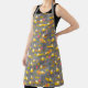 Under construction road work transportation work vehicles all over print apron. Fun yellow and orange dump trucks, excavators, road signs pattern.