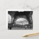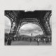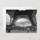 Under the famous Eiffel tower, this photo captures the great number of visitors to the icon. Under its steel frame, this postcard features a black and white photo of hundreds of visitors enjoying their visit.