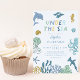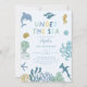 Cute boy's birthday party invitation card featuring illustration of sea creatures and coral reefs. The text says "under the sea."
