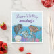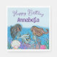 This magical and enchanting party napkin features an under the sea theme. Two beautiful black mermaids are swimming above seashells and plants. Their hair and tails are accented with gold glitter. The colorful sea plants feature colored glitter accents.