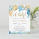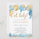 Under the sea, blue and gold baby shower invitation features watercolor seahorses, starfishes, seashells, and coral reefs with whimsical calligraphy. For more advanced customisation of this design, please click the BLUE DESIGN TOOL BUTTON. Matching items are also available.