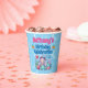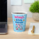 Adorable under the sea birthday party cups featuring a happy mermaid with a cute smile and rosy pink cheeks. She has long flowing white hair adorned with little pink and blue flowers. She is wearing a pink shell bikini top and has a fish tail with green scales. She is sitting surrounded by pink, blue and green shells and blue, pink and green coral. There is a happy pink starfish and a blue striped fish with her and hearts and bubbles floating around her. Above the image are templates in blue and pink text to add all your party details.