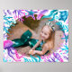 This design features a frame of watercolor under the sea creatures including jellyfish, sea shells, coral, starfish and more in a colour pallette of purple, turquoise and pink. You can customise the photo inside of the frame. This design is a lovely decor addition to your little girl's mermaid birthday party. See the whole matching collection.
