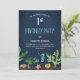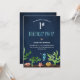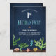 This nautical 1st birthday party invitation has a whimsical "Under the Sea" theme, with watercolor shells, a starfish, a seahorse, seaweed, and a pretty, textured navy blue background.