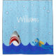 An under the sea, shark themed shower curtain. Pastel blue background, bubbles, blue waves, a scuba diver, and a shark. Template for a family name. A hand lettered style script in white.
