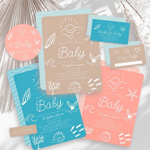 This cute 'Sea You Soon Baby' gender-neutral baby shower paper cup features a cafe au lait/brown/tan background with hand-drawn sunshine over waves, a whale tail, a school of fish, seashells, coral, and starfish—all in white. Personalize it for your needs. You can find matching products at my store.