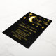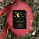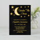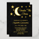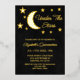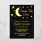 Under the stars quinceanera events. Black night sky background with gold moon and stars