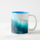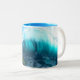 A massive wave leaps up from rough seas, sparkling white and blue and turquoise in the blazing sunlight. Under the wave, about to be submerged, is a little town with a castle and mediaeval cottages built on a rocky headland.
