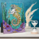 Original watercolor painting by Sandra Gale of a fantasy golden sea horse floating above an under sea tropical reef. Great image for kids, teens and anyone who loves sea horses and the ocean. Makes a great bathroom design too!